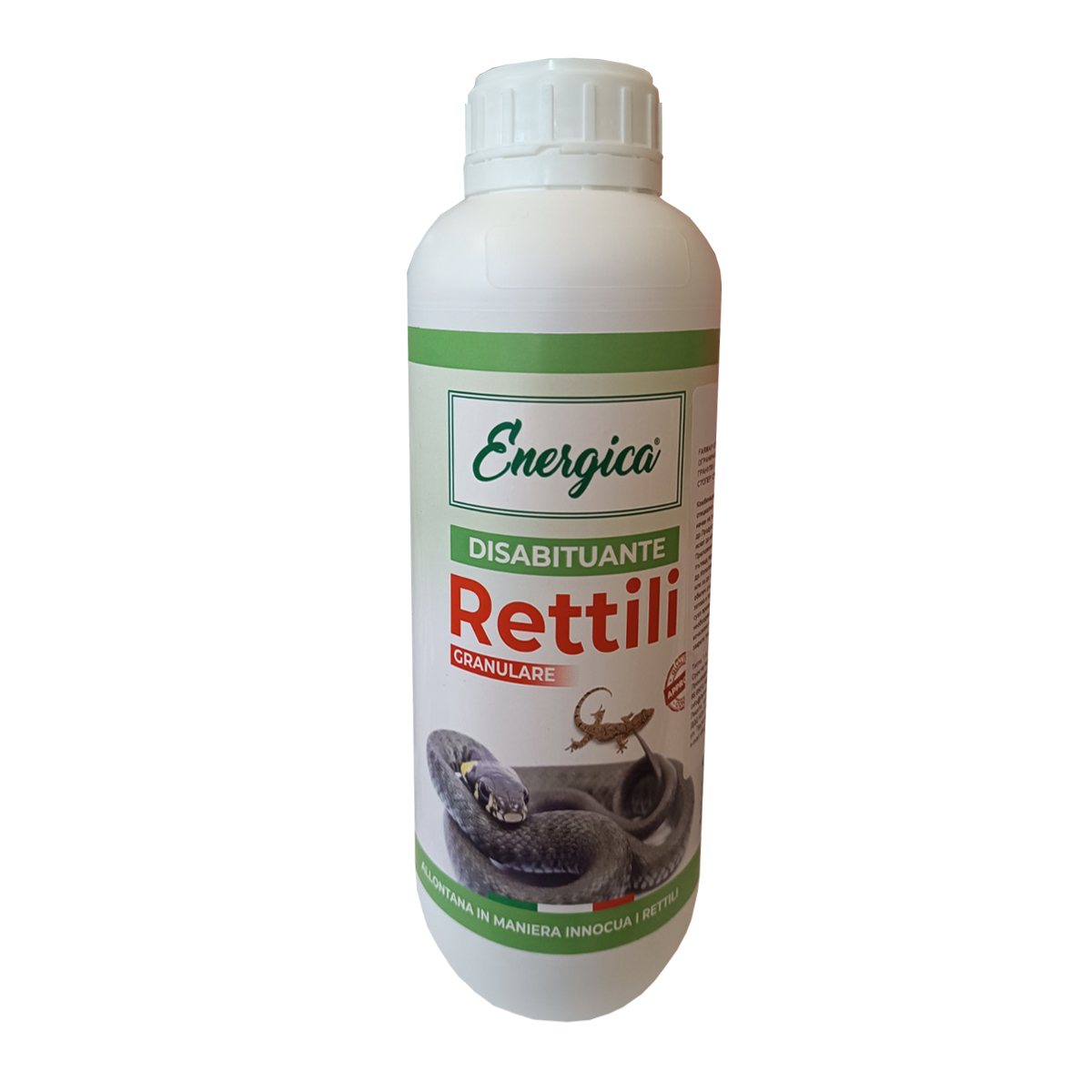 Energica Rettili е ефективен гранулиран продукт, специално създаден за прогонване на змии, гущери и други влечуги от обитаеми или нежелани за тях места. Благодарение на специалната си формула, продуктът отблъсква влечугите по естествен и безопасен начин, без да им вреди.