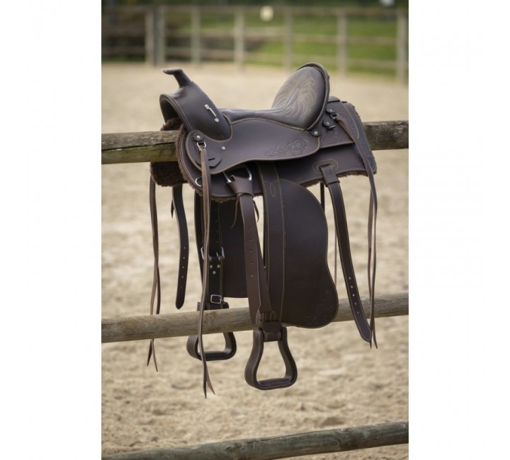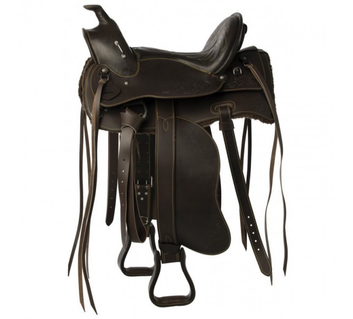 Уестърн седло от омаслена биволска кожа от мексикански тип. Подплатени със синтетична овча кожа, дървени стремена, покрити с кожа.